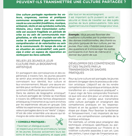 In addition, the guide provides practical advice for educators, facilitators, and artists seeking to implement collaborative and creative projects. It offers methodologies for organizing workshops, encouraging youth participation, and developing artistic projects that have a meaningful impact on their well-being. Through artistic biography, the guide promotes a true cooperative engineering approach, where every team member, whether professional or young participant, is actively involved in the creative and transformative process.
